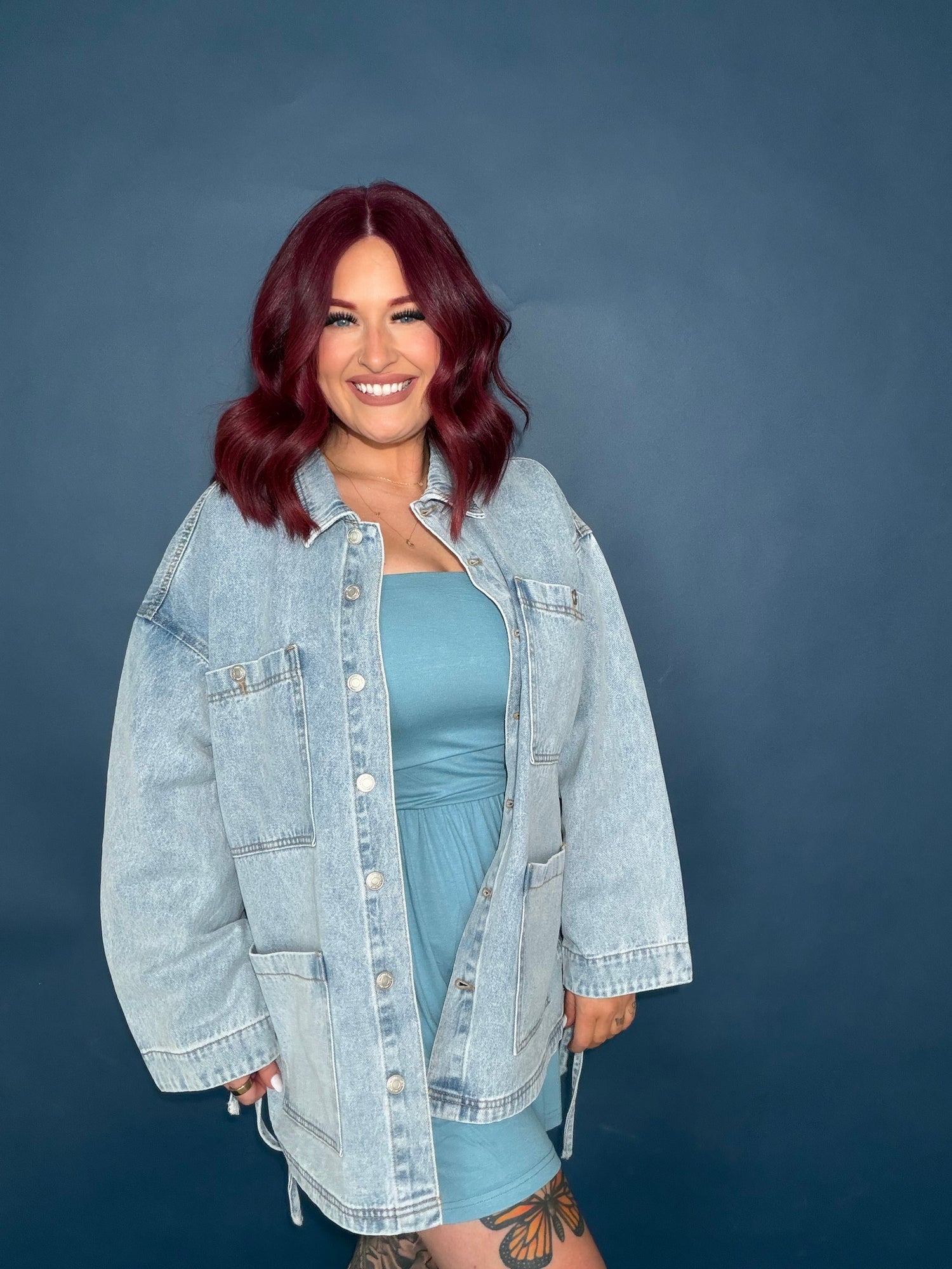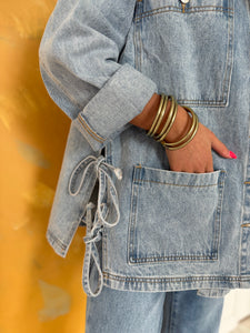 Effortlessly cool and full of boho charm, the Dakota Side-Tie Denim Jacket is your new go-to layering piece. Featuring an oversized, boyfriend fit and classic front pockets, this western-inspired denim jacket brings casual streetwear vibes with a stylish twist. The unique side tie detail adds a flattering, adjustable silhouette, making it perfect for festival days, weekend adventures, or casual everyday wear.