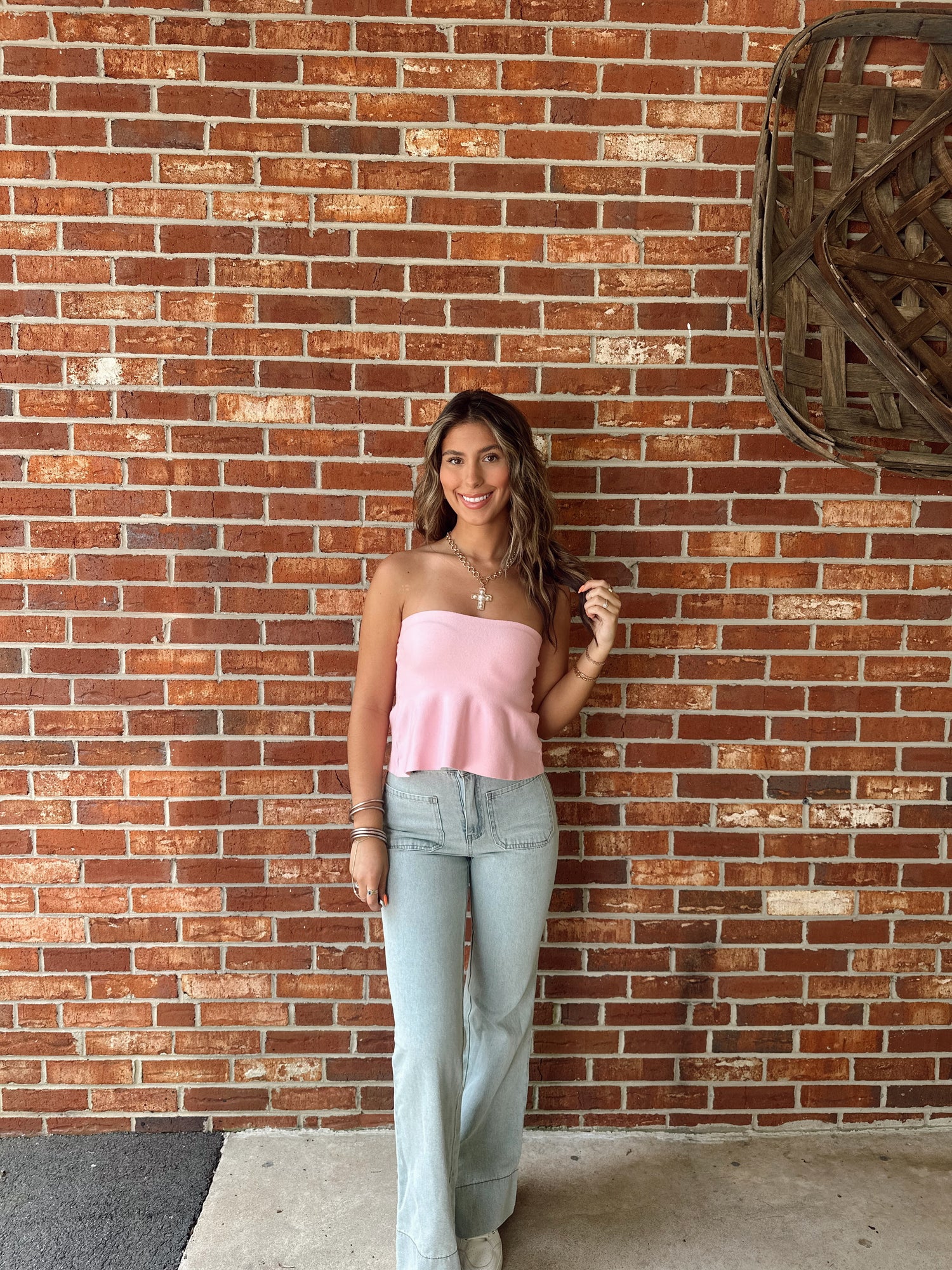 - Crafted from a soft, stretchy knit, this strapless top offers a snug, comfortable fit with a peplum hem that adds movement and shape.